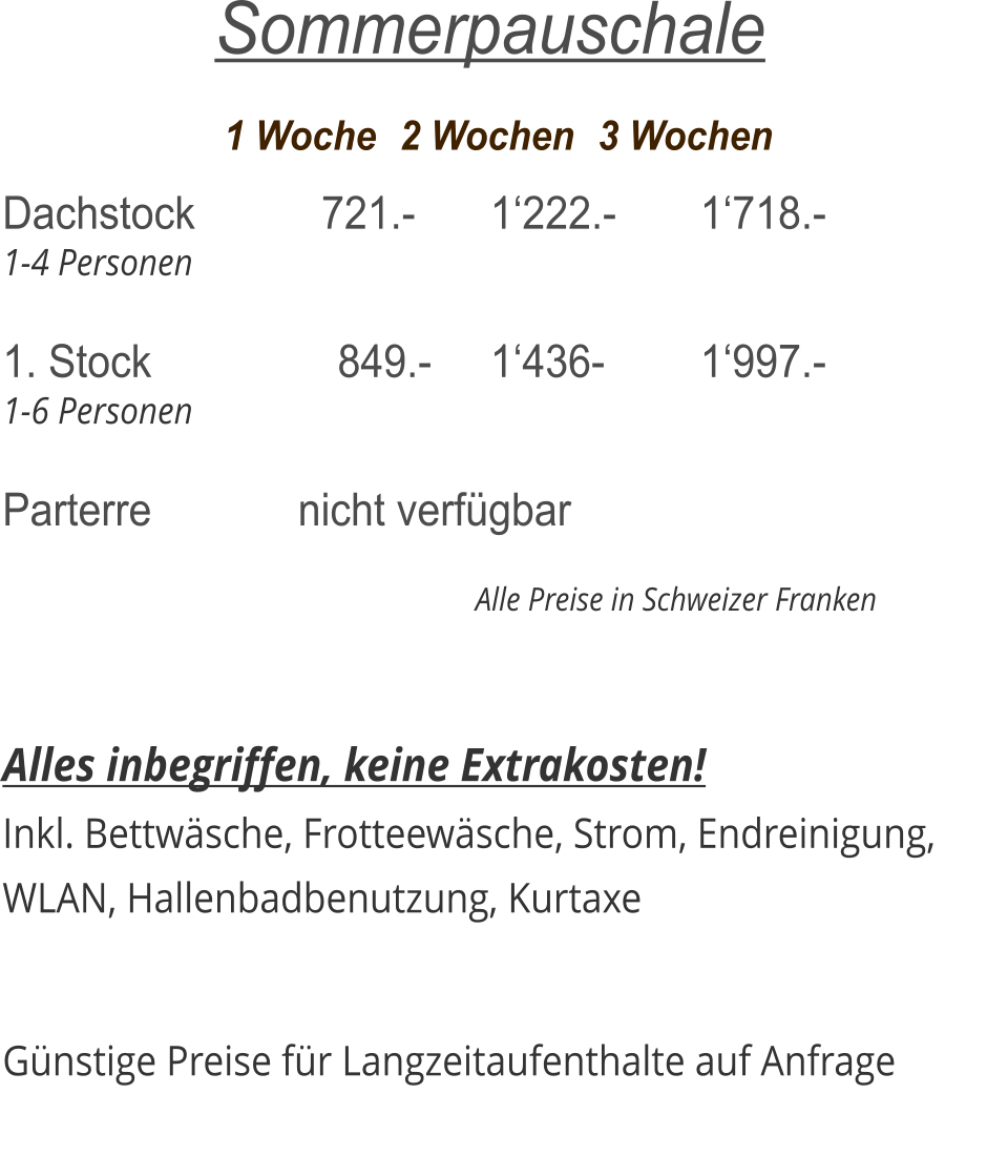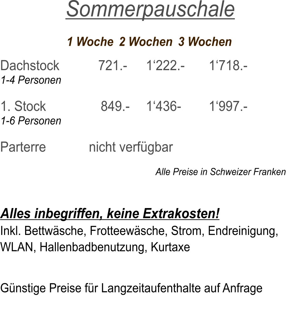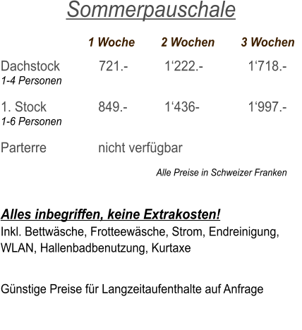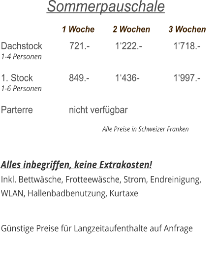 Saison		  Vor-/Nach	Zwischen	          Hoch Dachstock            959.-		  1‘260.-		  1‘505.- 1-4 Personen  1. Stock 	     	    1‘220.-		  1‘535.-	  	  1‘815.- 1-6 Personen  Parterre 		      nicht verfügbar                                                                  Alle Preise in Schweizer Franken   Alles inbegriffen, keine Extrakosten! Inkl. Bettwäsche, Frotteewäsche, Strom, Endreinigung,   WLAN, Hallenbadbenutzung, Kurtaxe  Vergünstigung bei 2 bzw. 3 Wochenaufenthalt.    Winter Wochenpauschale